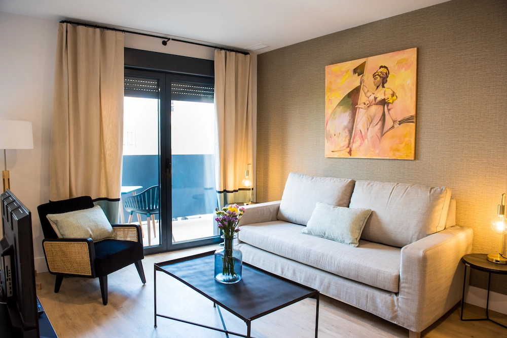 · Living and dining area · Aerothermal heating and cooling system · Low coffee table · Chairs · Wardrobe · Hangers · Sofa bed for children’s use · Smart TV · Free Wi-Fi · Balcony door