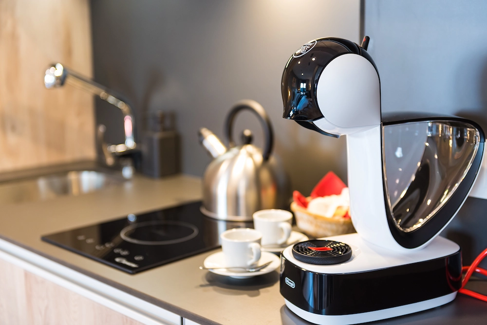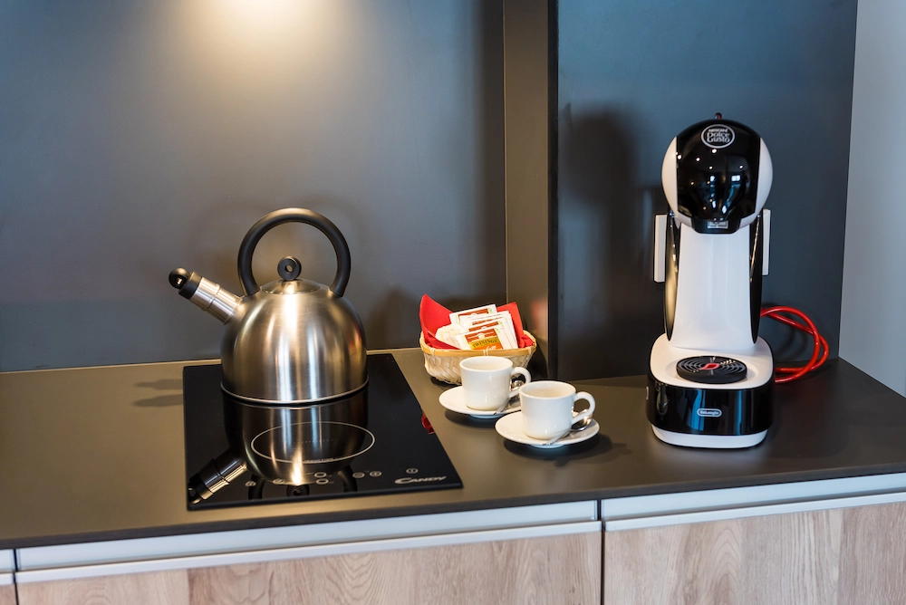 · Two-burner induction cooktop · Microwave · Cookware · “Dolce Gusto” Coffee maker · Toaster · Cutlery and kitchen utensils · Tableware and plates · Mini fridge · Kettle