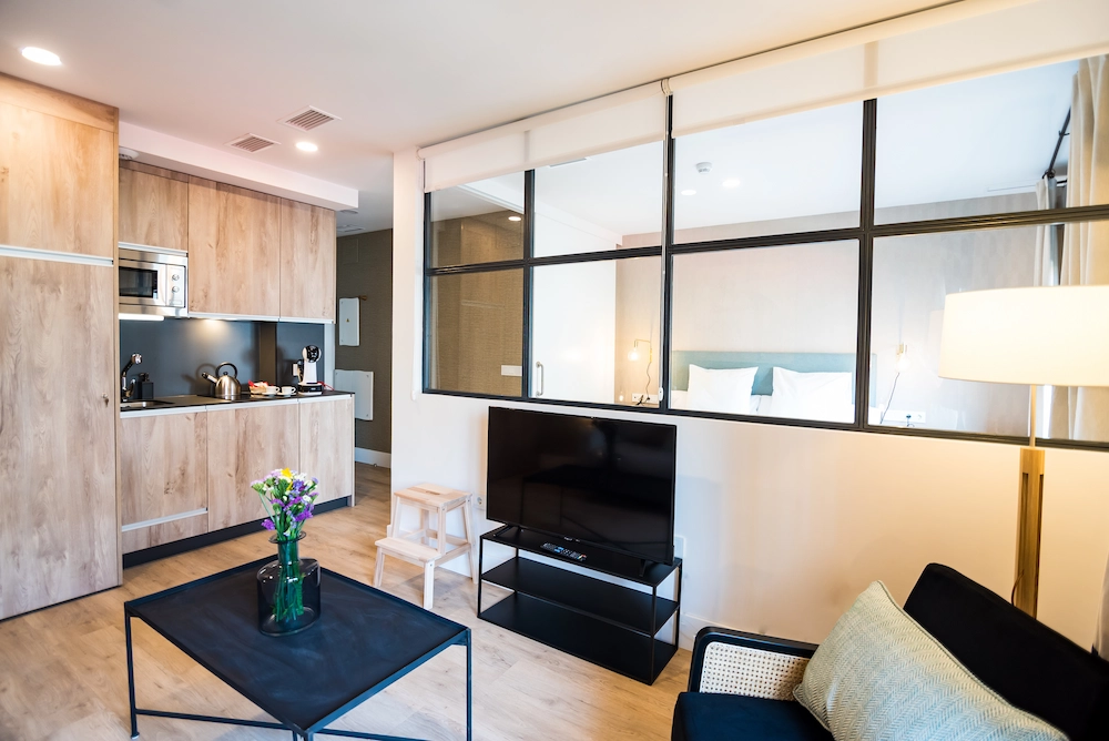 Studio apartment of approximately 40 square meters, consisting of one room with a King Size bed (180 x 200 cm), a bathroom with a shower, and an open area where the kitchen and living room coexist. Located on the facade of the building. The windows and balcony face Pages del Corro.